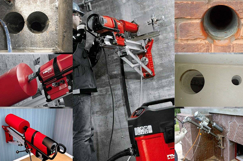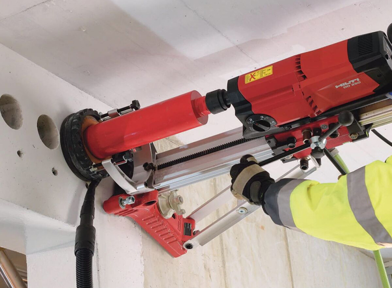Работаем в любых сложных условиях Любое направление сверления бетона без пыли и потери качества: горизонтальное, вертикальное (плиты перекрытий, фундамент), снизу вверх (в потолок), наклонное (под любым углом).